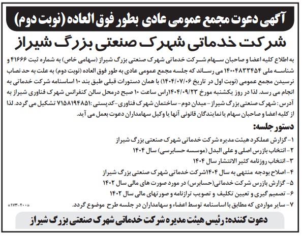 به اطلاع کلیه اعضا و صاحبان سهام شرکت خدماتی شهرک صنعتی بزرگ شیراز (سهامی خاص) به شماره ثبت 41666 و شناسه ملی 14004833454 می رساند که جلسه مجمع عمومی عادی به طور فوق العاده (نوبت دوم) به علت به حد نصاب نرسیدن مجمع عمومی (نوبت اول در تاریخ 06/07/1404) با همان دستورات قبلی طبق بند 10 اساسنامه شرکت خدماتی به انجام می رسد. لذا در روز یکشنبه مورخ 23/09/1404راس ساعت 10 صبح درمحل سالن کنفرانس شهرک فناوری شیراز به آدرس : شهرک صنعتی بزرگ شیراز- میدان دوم- ساختمان شهرک فناوری-کدپستی :7158194851 تشکیل می گردد.لذا از کلیه اعضا و صاحبان سهام یا نمایندگان قانونی آنها یا وکیل سهامداران دعوت بعمل می آید.